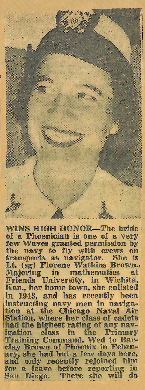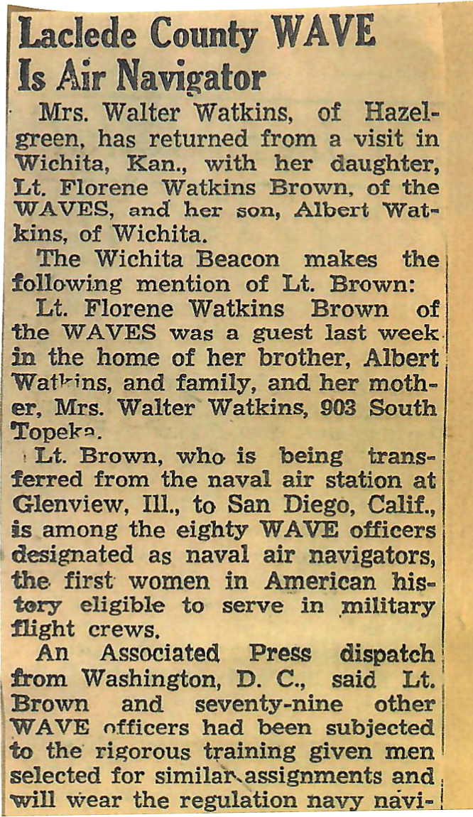 Florene Watkins enlisted in the Waves in December 1943 and immediately was assigned to officer candidate school in Northhampton, Mass, at Smithville College. One of her letters from Northhampton while in school said how much she loved it, how strenuous it was, and how great the food was! (perhaps an unusual report regarding the food) She graduated as Lieutenant Junior Grade in February, 1944. She was then assigned to Hollywood, Florida where she was trained (with a class of cadets, both male and female) in navigation.