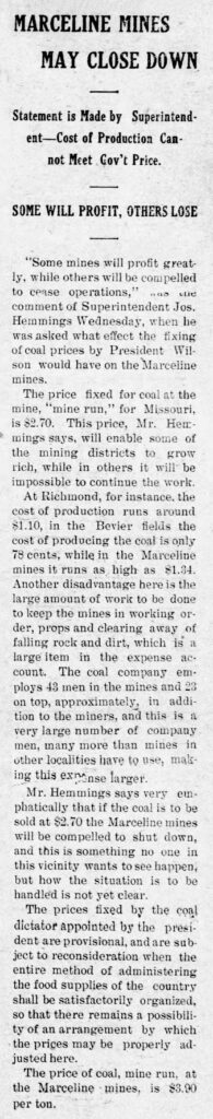 “Some mines will profit greatly, while others will be compelled to cease operations,” was the comment of Superintendent Jos. Hemmings Wednesday, when he was asked what effect the effect of coal prices by President Wilson would have on the Marceline mines.
