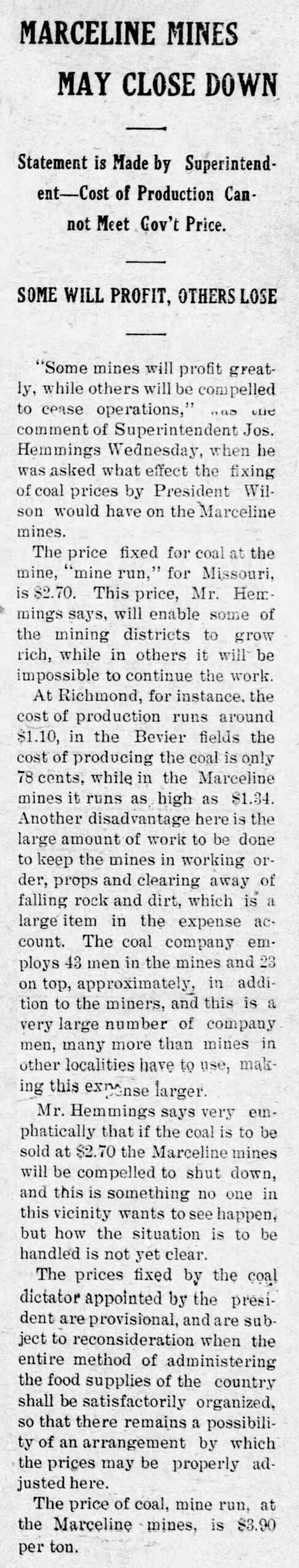 “Some mines will profit greatly, while others will be compelled to cease operations,” was the comment of Superintendent Jos. Hemmings Wednesday, when he was asked what effect the effect of coal prices by President Wilson would have on the Marceline mines.
