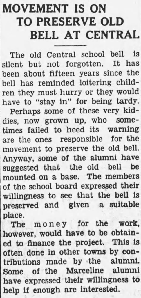 Perhaps some of these very kiddies, now grown up, who sometimes failed to heed its warning are the ones responsible for the movement to preserve the old bell. Anyway, some of the alumni have suggested that the old bell be mounted on a base. The members of the school board expressed their willingness to see that the bell is preserved and given a suitable place.