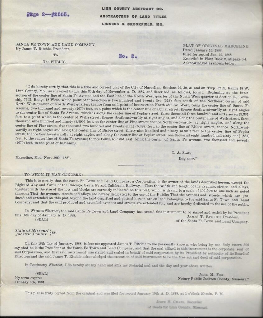 Letter from the Santa Fe Town and Land Company to the Public with the “PLAT OF ORIGINAL MARCELINE.” Taken from the Linn County Abstract Co. Abstracters of Land Titles, Linneus & Brookfield, MO dated November 30, 1887.